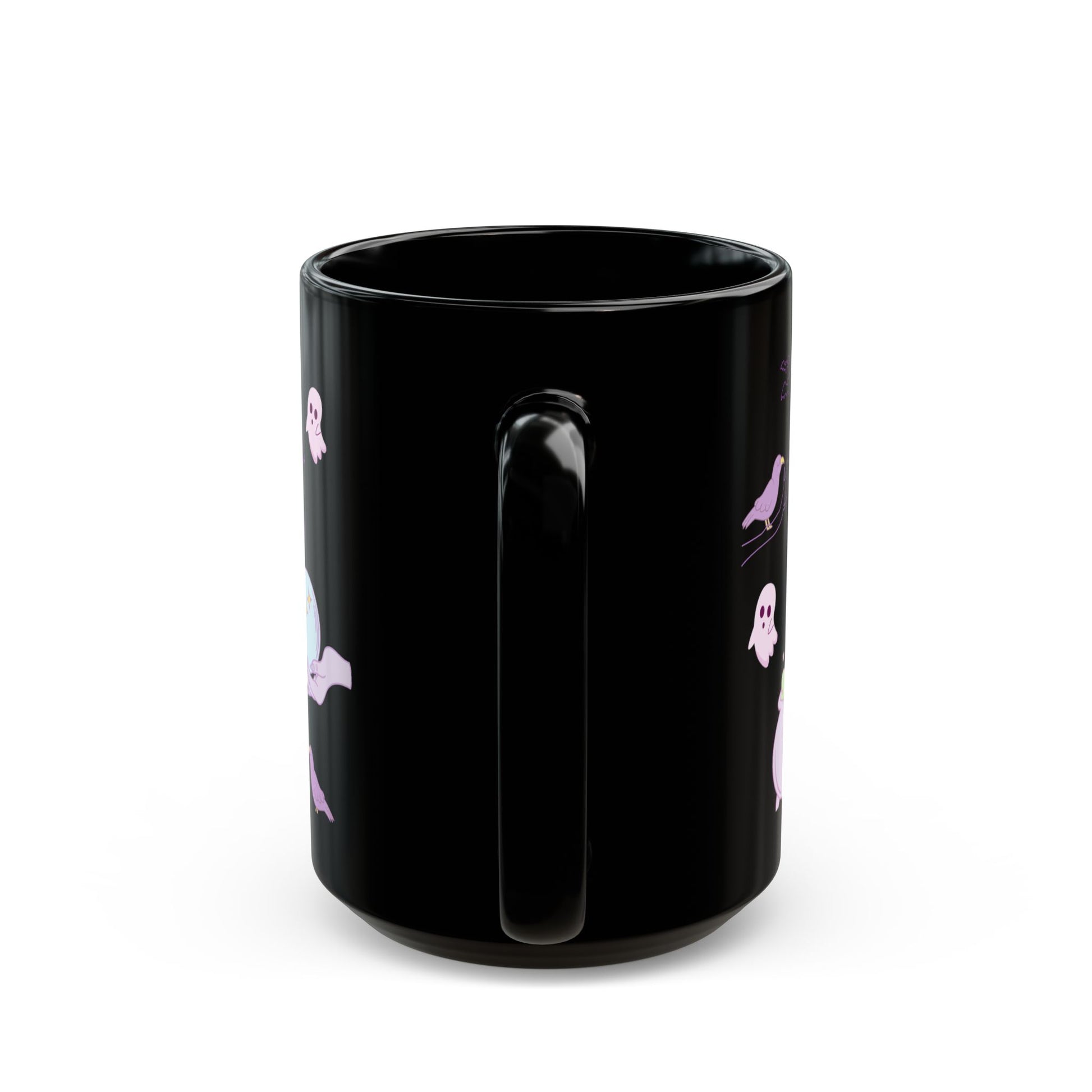 A Halloween themed mug perfect for spooky season. This black ceramic mug with a glossy finish features vibrant colors and is microwave and dishwasher safe. Suitable for adults, this mug is perfect for Halloween enthusiasts looking to add a spooky touch to their daily coffee or tea routine.